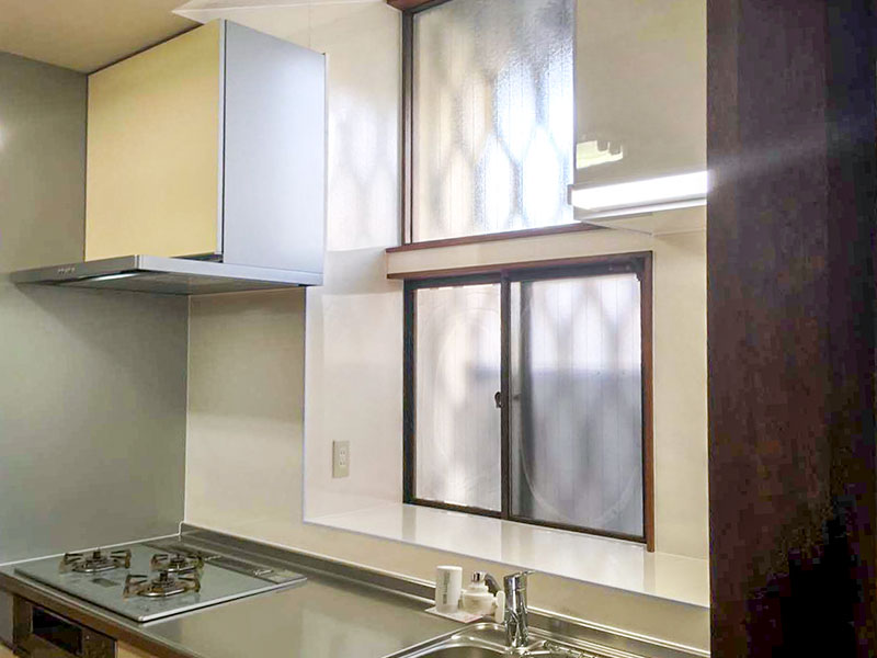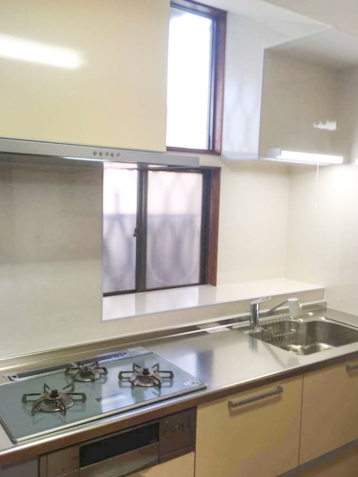 ・ガスコンロの位置を既設と反対側に取り付けました。レンジフードも併せて移設しましたが、天井裏で配管を回すことで既存の換気口を利用することができた。