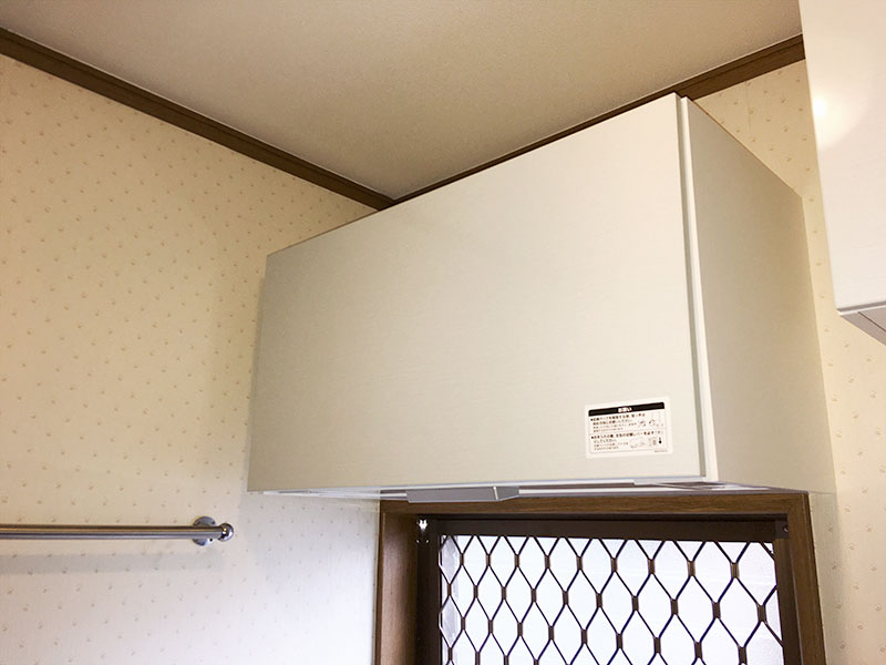 洗面台の吊戸棚以外に、洗濯機上部にも昇降タイプの吊戸棚を設置させていただきました。